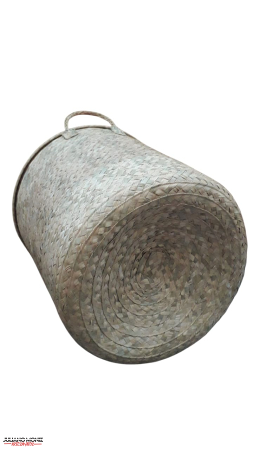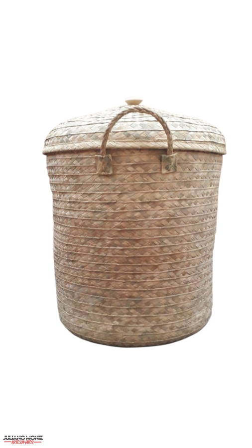 Vaso organizador com tampa em palha de carnauba alças de taboua botão puxador de madeira medida 50x42 cm valor 220,00