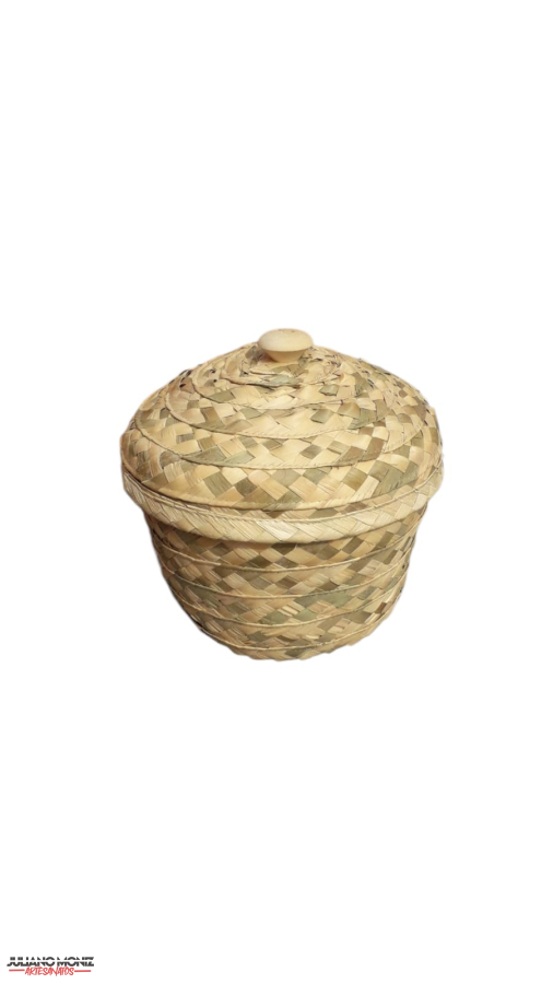 Porta treco em palha de carnauba botão puxador de madeira modelo redondo medida 19x21 cm