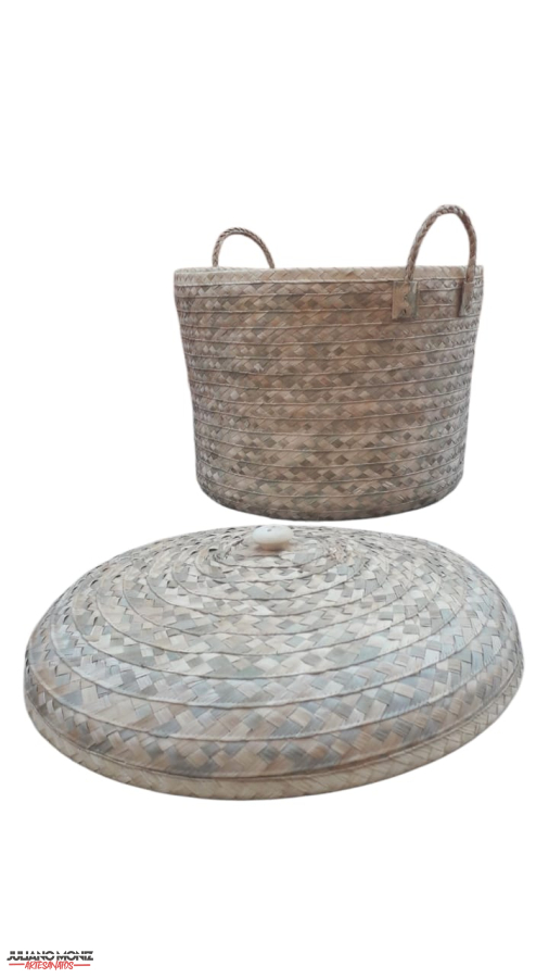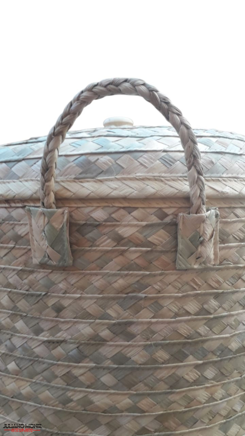 Vaso organizador com tampa em palha de carnauba alças de taboua botão puxador de madeira medida 40x42 cm
